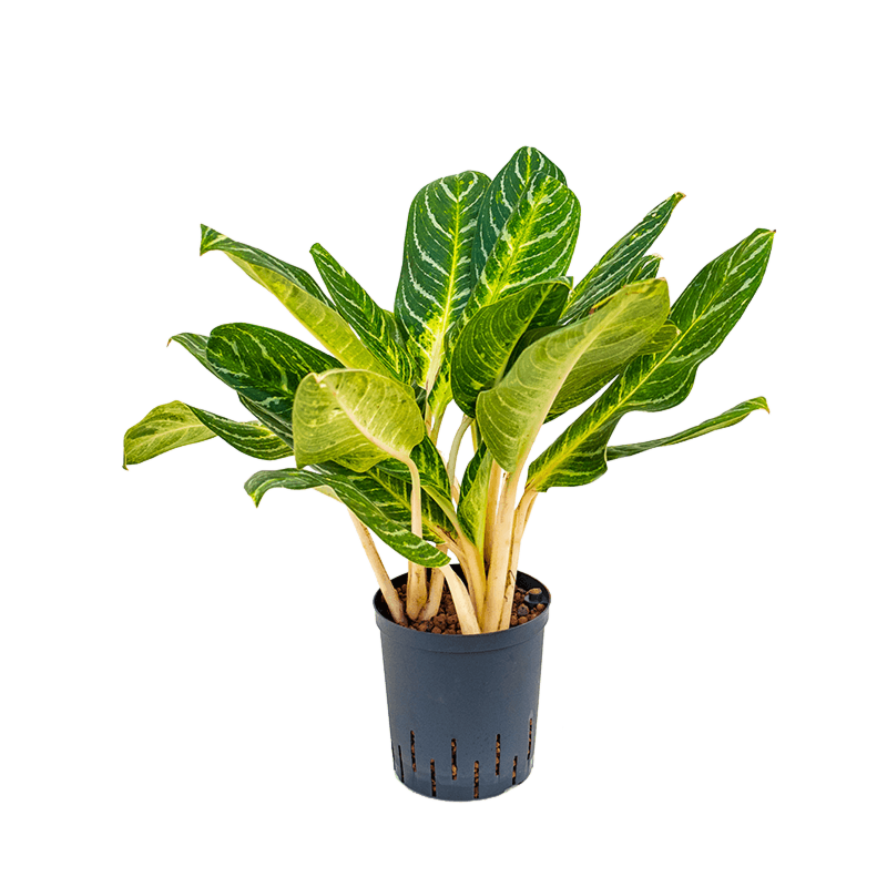 Lanzetvormige limegroene bladeren met witte stelen. Een makkelijk te onderhouden hydroplant op hydrocultuur.