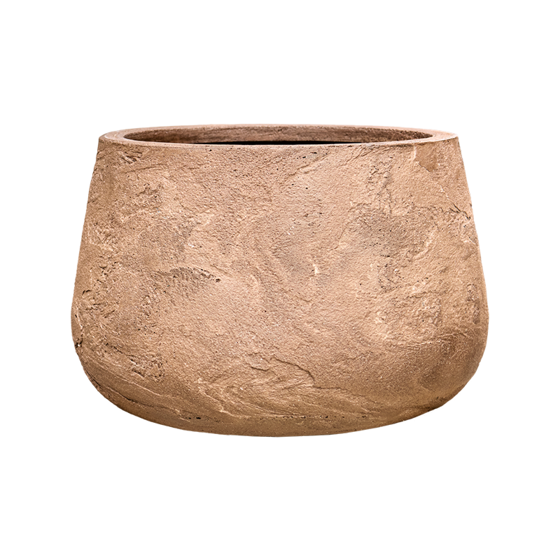 De Baq Algar is een ronde plantenbak van 34 x 51 cm, met een natuurlijke, aardse kleur en een ruwe textuur die perfect past in elke kantoortuin of werkplek.