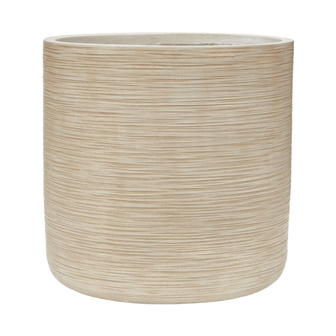 Strakke, ronde plantenbak in lichtbeige tint, met een moderne, textuur. Ideaal voor kantoorplanten.