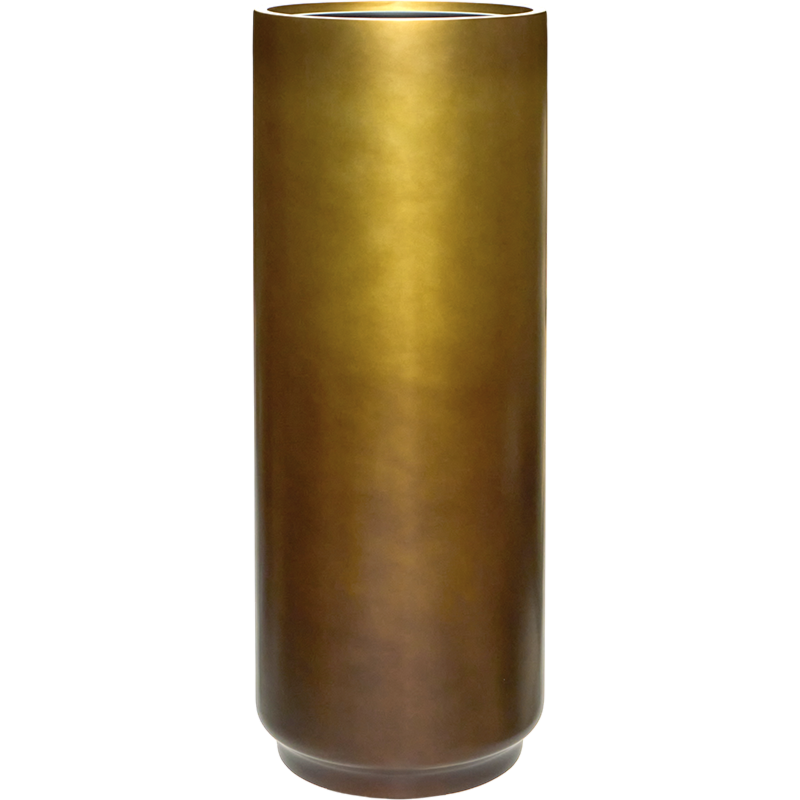 Hoge cilindervormige plantenbak (100×40 cm) met warme goudbruine gradient en glad, mat oppervlak. Een blikvanger voor kantoor.