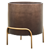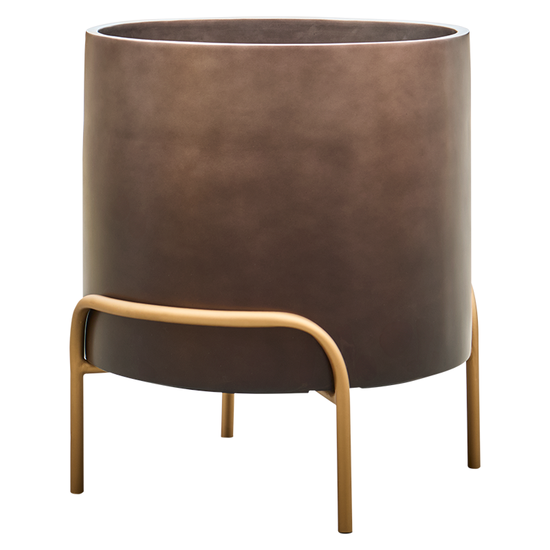 Strak, bruin met een matte afwerking. De ronde vorm staat elegant op het gouden onderstel.
