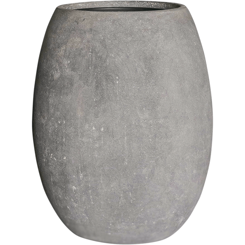 Grote, grijze plantenbak in een elegante, afgeronde vorm.