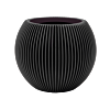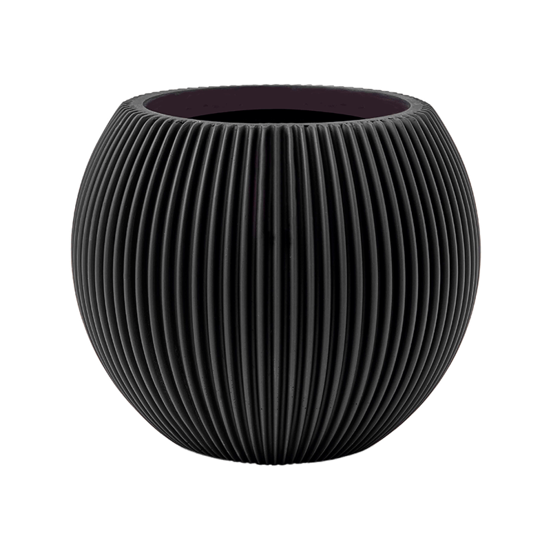 Ronde, bolle plantenbak in matzwart met strakke verticale groeven voor een modern ribbelpatroon. Geschikt voor kamerplanten en tuinplanten.