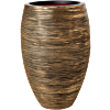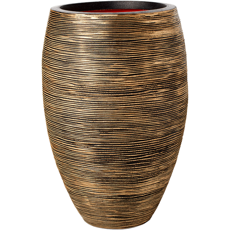 Ronde, hoge vaasvormige plantenbak (Ø56×h85 cm) in warme goudkleur met fijne horizontale ribben en donkere groeven. Grote bloempot geschikt voor grote kamerplanten.