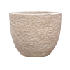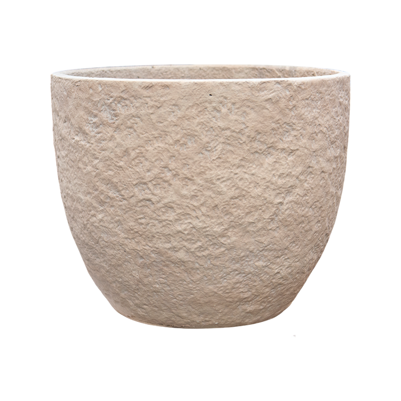 Deze plantenbak heeft een ronde vorm en een ruwe, natuurlijke textuur. De lichte beige kleur geeft een warme uitstraling, perfect voor elke kantoorruimte.