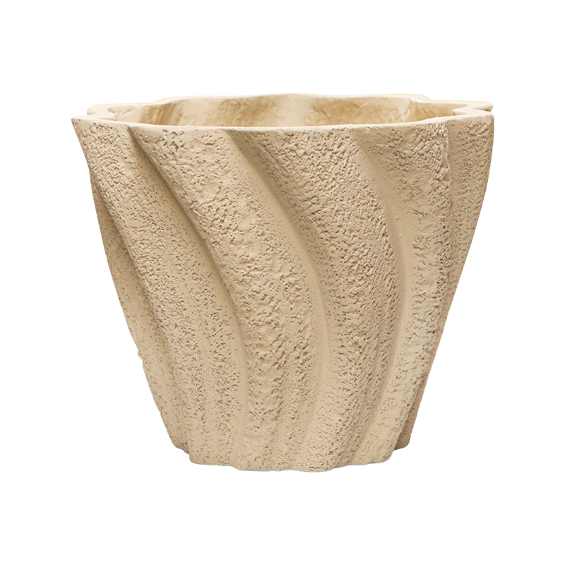 Deze plantenbak, 'Drift', heeft een unieke en organische vorm met golfachtige lijnen. De zachte beige kleur zorgt voor een natuurlijke uitstraling, perfect voor elke ruimte. Met een hoogte van 24 cm en een diameter van 30 cm is hij geschikt voor planten met een wortelkluit tot 25cm.