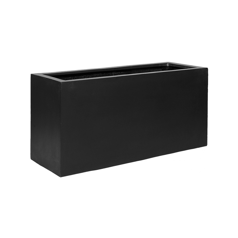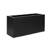 Deze strakke, zwarte plantenbak van fiberstone heeft een moderne, rechthoekige vorm. Perfect voor elke kantoorruimte als roomdivider.