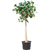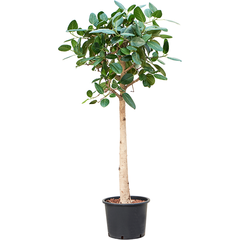 Slanke stam, bolle kruin, donkergroene glans. Een Ficus op stam, een boom voor kantoor.