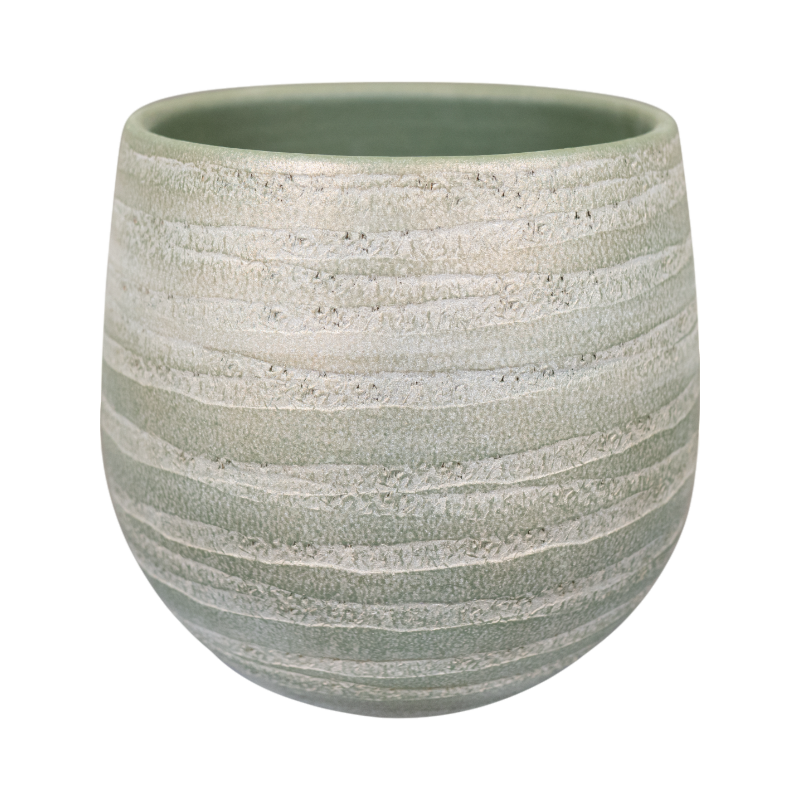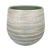 Ronde, keramieken plantenbak (Ø36×32 cm) in zachte olijfgroen met reliëfstrepen rondom. Matte, licht geribbelde keramiek. Een rustige en natuurlijke uitstraling voor kamerplanten.