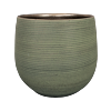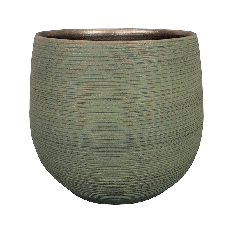 Lydia: bolvormige plantenbak Ø36×H32 cm. Matte saliegroene buitenkant met fijne horizontale ribbels en de binnenrand is donkerbruin geglazuurd. Keramieken bloempot van de TS collectie.