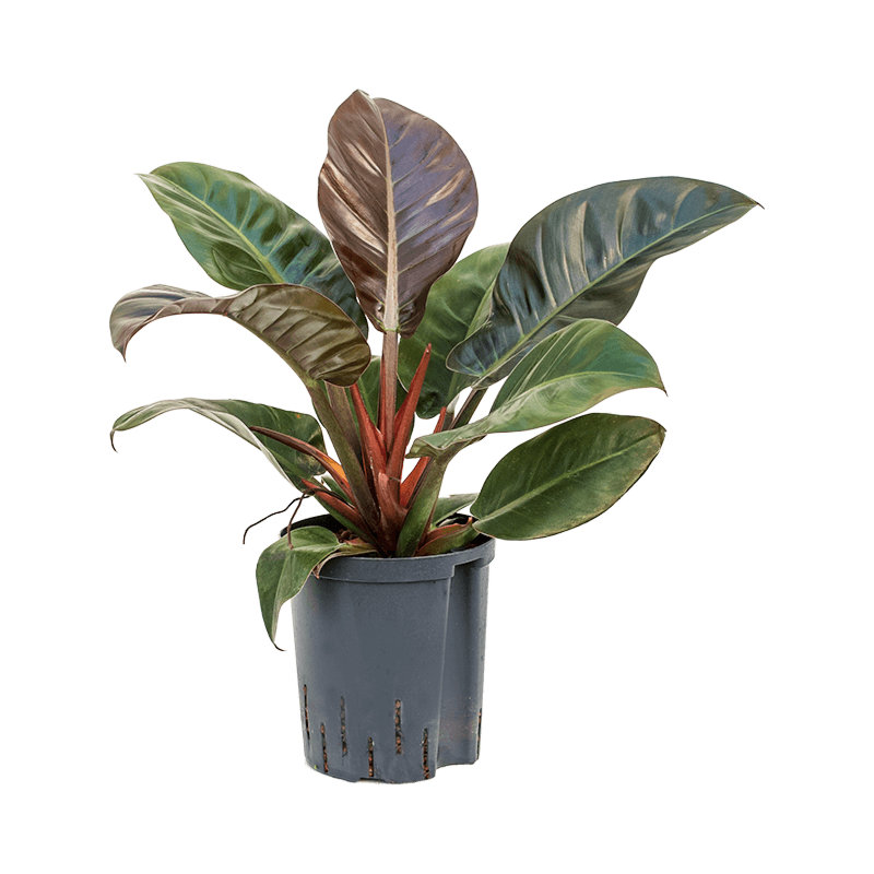 Hydrocultuur kantoorplant met grote ovale, glanzende bladeren: dieprode kleur. Mooie kamerplant of een kantoorplant in een roomdivider.