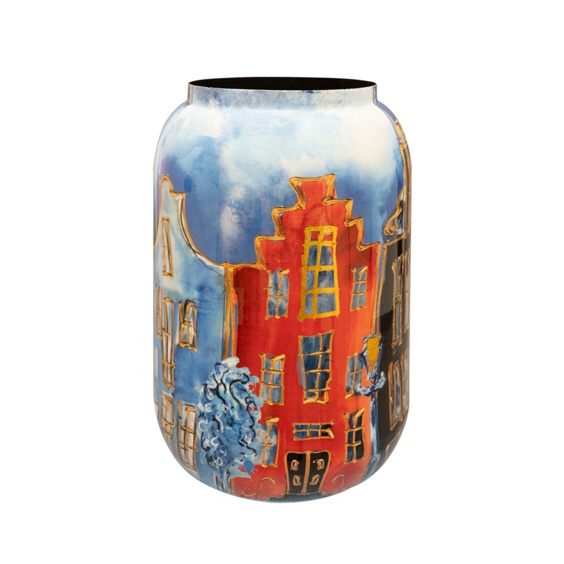 Breng kunst in huis met deze exclusieve bloempot, ontworpen door de Nederlandse kunstenaar Rick Triest. Dit luxe designstuk is voorzien van een betoverende print van iconische Amsterdamse grachtenpanden, waarbij enkele panden extra worden uitgelicht met een unieke kleuraccent. De kenmerkende artistieke gouden lijn, die vaak terugkomt in het werk van Triest, geeft de bloempot een extra verfijnde uitstraling.