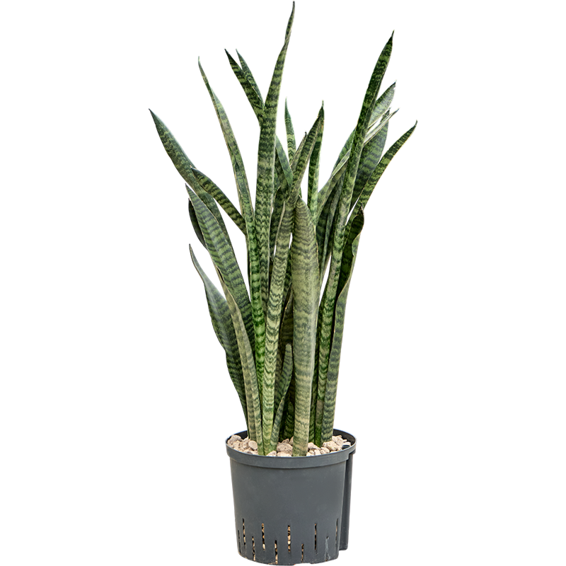 Geef een Sansevieria op hydrocultuur eenmaal per maand water tot het middelste streepje op de meegeleverde watermeter, gemarkeerd als OPT, wat de optimale waterstand aangeeft. Laat tussen de gietbeurten de watermeter zakken tot het MIN-niveau. (toelichting)