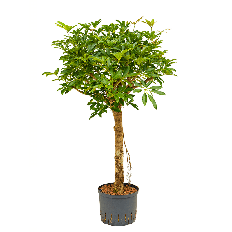 Compacte, groene Schefflera met glanzende bladeren. Als hydroplant geschikt voor de werkplek.