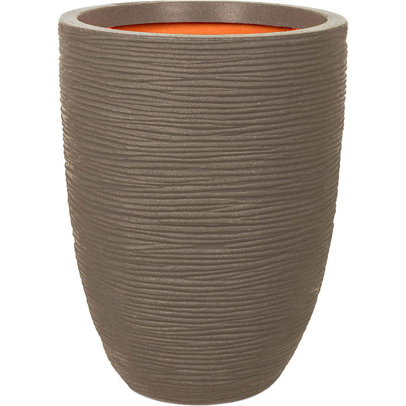 Hoge, licht taps toelopende cilindervormige plantenbak in taupe met horizontale ribbels en matte structuur. Ø 46 cm x 58 cm. Geschikt voor kamerplanten en tuinplanten.